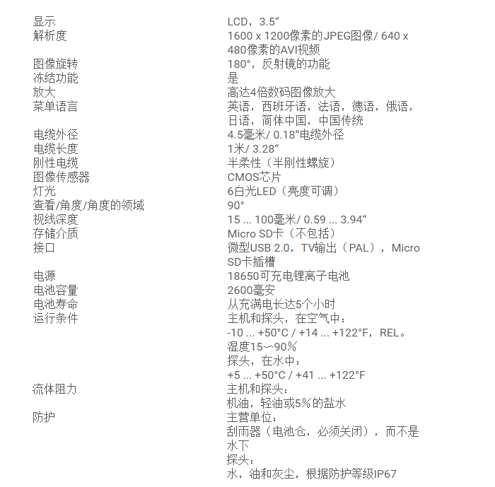 該內(nèi)窺鏡存儲記錄的圖像和視頻直接到micro SD卡內(nèi)存。在1米/ 3.28'的電纜長度和4.5毫米/“直徑0.18允許視頻檢查照相機***的訪問,以查看壁,管道,通風(fēng)孔管道。