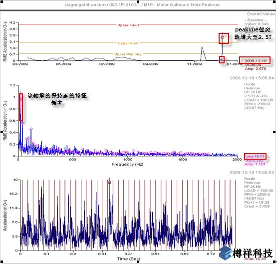 圖1:電機(jī)后軸承位置Peakvue值趨勢、頻譜及時域單峰波形