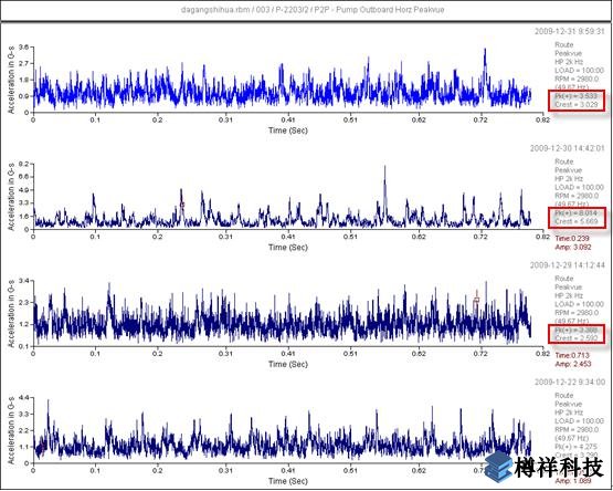 2009年12月30日監(jiān)測時發(fā)現(xiàn)三聯(lián)合P-2203/2泵側(cè)出口端軸承波形上但突然出現(xiàn)沖擊信號,Peakvue值突然增大,從0.4到0.7,沖擊幅值從3突然漲到8,呈現(xiàn)明顯的沖擊,但振動基本無變化,如下圖所示