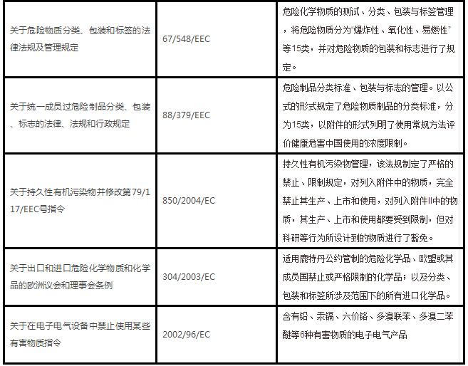 第二階段是1967-2001年,在歐洲共同體成立后,建立了“舊”化學(xué)品管理體系。這是由不同歷史時(shí)期的指令和制度拼湊起來(lái)的;并先后通過(guò)發(fā)布了67/548/EEC指令(危險(xiǎn)化學(xué)品的分類(lèi)、包裝及標(biāo)注)、88/379/EEC指令(危險(xiǎn)制劑的分類(lèi)、包裝和標(biāo)注)、76/769/EEC指令(某些危險(xiǎn)物質(zhì)和制劑限制銷(xiāo)售和使用)、793/93/EEC指令(現(xiàn)有物質(zhì)危險(xiǎn)性評(píng)估和控制)等。
