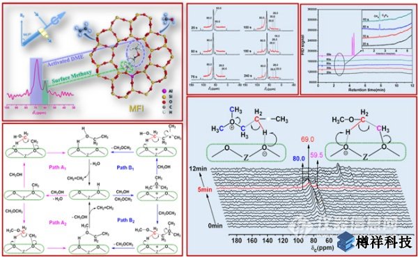 本項工作中,研究人員通過在線監(jiān)測***初始反應(yīng)階段,推測初始烯烴來源于催化劑表面C1吸附物種的直接轉(zhuǎn)化;隨后通過催化劑液氮淬冷和固體核磁表征,確定了催化劑上***初始反應(yīng)階段存在的表面C1吸附物種(甲醇和二甲醚)和C1活性物種(表面甲氧基和三甲基氧鎓離子);進(jìn)一步通過原位固體核磁研究,在真實甲醇轉(zhuǎn)化反應(yīng)條件下,成功捕捉到二甲醚C-H鍵活化后生成的類亞甲氧基(methyleneoxy analogue)物種,由此獲取了C1物種活化生成***個C-C鍵的直接證據(jù);在此基礎(chǔ)上提出了初始烯烴生成的反應(yīng)路徑—表面甲氧基/三甲基氧鎓離子協(xié)助甲醇/二甲醚活化轉(zhuǎn)化的協(xié)同反應(yīng)機(jī)理。
