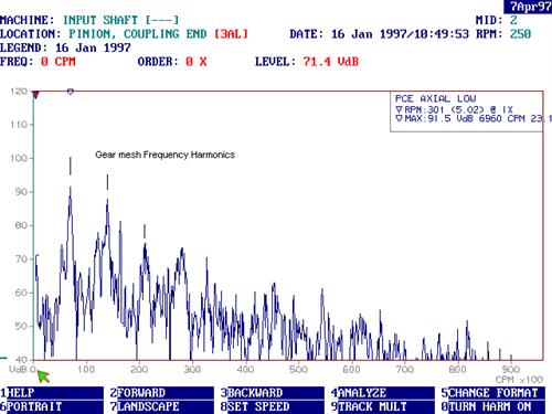 定期對齒輪箱中的潤滑油進行分析,***后的報告指出油中含有鐵顆粒。維護主管詢問我們是否可以確定油污染的來源,我們做的***件事就是檢查軸承附近測得的振動頻譜。光譜看起來很正常,沒有軸承色調(diào)的跡象,因此我們懷疑金屬來自一個或多個齒輪(見圖2)。然后問題是識別故障齒輪(如果有的話),以便能夠毫不拖延地進行維護工作。