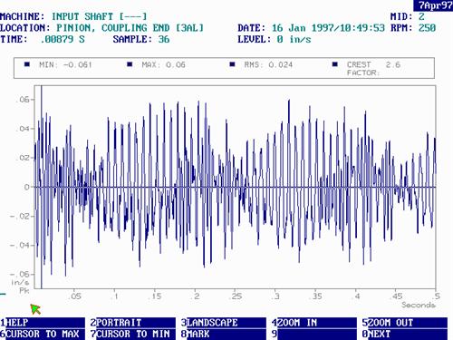 這允許來自齒輪的整個振動信號在時域平均中被強調(diào),并且來自其他齒輪的所有振動分量,軸轉(zhuǎn)速和軸承音調(diào)等被平均。這會產(chǎn)生一個時間波形,顯示齒輪上的各個齒,其中來自機器的其他部件的污染非常小。在進行同步平均時,分析儀的分析參數(shù)會進行調(diào)整,因此時間記錄長度比齒輪上的一次旋轉(zhuǎn)多一點時間。這很容易實現(xiàn),因為時間記錄長度(T)是頻譜中FFT線間距(DF)的倒數(shù)。這只是選擇頻率跨度和線數(shù)的問題,因此1 / DF長于1除以齒輪速度(赫茲)(Hz)。當(dāng)然,